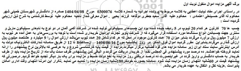 چسب ها 70 کارتون هر کدام 20 تیوپ در 5 ردیف چیده شده بود این چسب های سیلیکونی تولید شده در شرکت آکمی آلمان در دو نوع به نام های سیلیکون ماربل و سنتری جهت چسباندن انواع سنگ ها مورد استفاده قرار می گیرد که از شرکت پاویر تجارت ایرانیان خریداری شده است با توجه به بررسی های به عمل آمده هر تیوب به ارزش 7 میلیون ریال برآورد می گردد بنابر میزان 70 عدد کارتون موجود در محل که هر کدام شامل 20 عدد تیوب می باشد ارزش اموال را 9 میلیارد و هشتصد میلیون ریال ارزش گذاری می گردد.بنابراین مقرر گردید اموال فوق الذکر در روز یکشنبه مورخ 1404/06/16 ازساعت8 تا 12 از طریق سامانه تدارکات الکترونیک دولت به آدرس اینترنتی سایت ستاد ایران زیر سامانه مزایده های قوه قضائیه برگزار میگردد.مزایده از قیمت پایه کارشناسی شروع و به هرکسی که بالاترین نرخ پیشنهادی را ارائه نماید فروخته خواهدشد. ده درصد مورد پیشنهادی فی المجلس نقداً از خریدار دریافت می گردد و الباقی ثمن پیشنهادی ظرف مدت یک ماه از تاریخ مزایده باید از طرف خریدار به حساب دادگستری واریز گردد در غیراینصورت ده درصد دریافتی روز مزایده به نفع دولت ضبط و مزایده برای یک بار دیگر تجدید خواهد گردید. درصورتی که پیشنهاد قیمت در 60ثانیه انتهای زمان مزایده ثبت شود ،سامانه بصورت خودکار180ثانیه زمان مزایده را تمدید می نماید .تکرار این امرتا انتهای وقت اداری امکان پذیراست .هزینه نقل و انتقال به عهده خریدار می باشد.