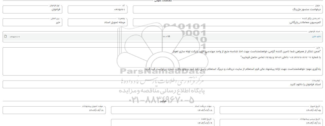 تاریخ بررسی پیشنهادات: 1404.06.18 - تاریخ انقضاء: 1404.06.19