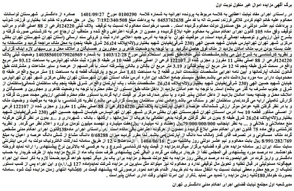 در راستای اجرای مفاد نیابت اعطایی به کلاسه مربوط به پرونده اجرائیه به شماره کلاسه 0100290 مورخ 1401/09/27 صادره از دادگستری شهرستان لواسانات محکوم علیه خانم الهام کردی کلاکی فرزند: نصرت اله با کد ملی 0453762638 به پرداخت مبلغ 7/192/340/508 ریال در حق محکوم له خانم ندا بختیاری فرزند: شوذب و پرداخت نیم عشر دولتی در حق صندوق دولت محکوم گردیده است. ، حسب درخواست محکوم له نسبت به توقیف پلاک ثبتی 124220فرعی از 88 اصلی اقدام و مراتب توقیف وفق ماده 105 قانون اجرای احکام مدنی به محکوم علیه ابلاغ گردیده و مصون از هرگونه اعتراض واقع شده و متعاقب آن ارجاع امر به کارشناس صورت گرفته و بشرح ذیل ارزیابی و توصیف اجمالی گردیده است: در موقعیت تهران با توجه به آدرس جدید اعلامی اداره ثبت و کروکی سند ارسالی (استان تهران شهرستان تهران بخش مرکزی شهر تهران تهرانپارس خیابان شهید حسین الهی (230 شرقی)خیابان شهید بختیاری(لاله)پلاک 24و26 شرق طبقه پنجم) به محل ملک مراجعه گردید و متاسفانه به علت بسته بودن درب ملک امکان بازدید از ملک فوق حاصل نگردید و با توجه به وضعیت ظاهری و مجاورین و همسایگان و املاک محل و بررسیهای لازم اینک گزارش و نظریه کارشناسی به شرح ذیل می باشد.مشخصات ثبتی ملک:طبق تصویر استعلام ثبتی مورخ 1403/12/28 به شماره 140385601079026969 وضعیت ثبتی پلاک 124220فرعی از 88 اصلی بخش 11 مفروز و مجزی شده از 122107 فرعی از اصلی مذکور قطعه 10 در طبقه 5 حوزه ثبت ملک تهرانپارس به مساحت 93.12 متر مربع واقع در سمت شرق طبقه پنجم که 12 متر مربع آن پیشرفتگی و 3.19 متر مربع آن بالکن و بالکن پیشرفته است. با قدرالسهم از عرصه و سایر مشاعات و مشترکات طبق قانون تملک آپارتمانها و آیین نامه اجرایی مشخصات منضمات انباری قطعه 2 به مساحت 1.61 متر مربع و پارکینگ قطعه 4 به مساحت 11 متر مربع واقع در طبقه 0 محدودیت دارای سه مورد بازداشت دائم می باشد.مطابق سیستم جامع املاک این اداره آدرس ملک استان تهران شهرستان تهران بخش مرکزی شهر تهران تهرانپارس خیابان شهید حسین الهی (230 شرقی)خیابان شهید بختیاری(لاله)پلاک 24و26 مشخصات ملک : یک آپارتمان واقع در شرق طبقه پنجم یک ساختمان شمالی(ساختمان از شرق و جنوب مشرف به گذر می باشد) است. با توجه به عدم امکان بازدید از داخل ملک طبق دستور آن مقام محترم با توجه به وضعیت ظاهری و مجاورین و همسایگان و املاک محل و چناچه بعدا امکان بازدید از داخل امکان پذیر شود و یا سایر مدارک موثر بر قیمت ارایه گردد.با دستور مقام محترم قضایی ارزیابی مجدد صورت گرفته و گزارش تکمیلی ارایه می گردد.نمای ساختمان آجر و سنگ می باشد.(عکس نمای ساختمان پیوست گزارش می باشد.) نظریه کارشناسی: با توجه به موقعیت و وضعیت ملک و با در نظر گرفتن کلیه عوامل موثر ارزش ششدانگ عرصه و اعیان آپارتمان به پلاک ثبتی 124220فرعی از 88 اصلی بخش 11 مفروز و مجزی شده از 122107 فرعی از اصلی مذکور قطعه 10 به آدرس استان تهران شهرستان تهران بخش مرکزی شهر تهران تهرانپارس خیابان شهید حسین الهی (230 شرقی)خیابان شهید بختیاری(لاله)پلاک 24و26 شرق طبقه 5 بدون در نظر گرفتن هرگونه بدهی احتمالی به هریک از سازمانها ، ارگانها ، بانک ، شهرداری و ...و بدون در نظر گرفتن هرگونه منع معاملاتی و خلافی و ... به نظر اینجانب 79/000/000/000ریال (هفتاد و نه میلیارد ریال)هفت میلیارد و نهصد میلیون تومان برآورد و اعلام نظر می گردد. و نظریه کارشناس وفق ماده 75 قانون اجرای احکام مدنی ابلاغ گردیده و مصون از هرگونه اعتراض باقی مانده است .در راستای اجرای ماده138قانون اجرای احکام مدنی مشخص گردد ملک مسکونی و در تصرف آقای گمار (مالک سه دانگ از آپارتمان)می باشد. لذا مقرر گردید میزان 0/68288 دانگ مشاع از شش دانگ عرصه و اعیان به مبلغ 8/991/282/769 ریال بابت محکوم و نیم عشر دولتی روز یکشنبه مورخ 1404/06/16 ازساعت8 تا 12 از طریق سامانه تدارکات الکترونیک دولت به آدرس اینترنتی سایت ستاد ایران زیر سامانه مزایده های قوه قضائیه برگزار میگردد.مزایده از قیمت پایه کارشناسی شروع و به هرکسی که بالاترین نرخ پیشنهادی را ا