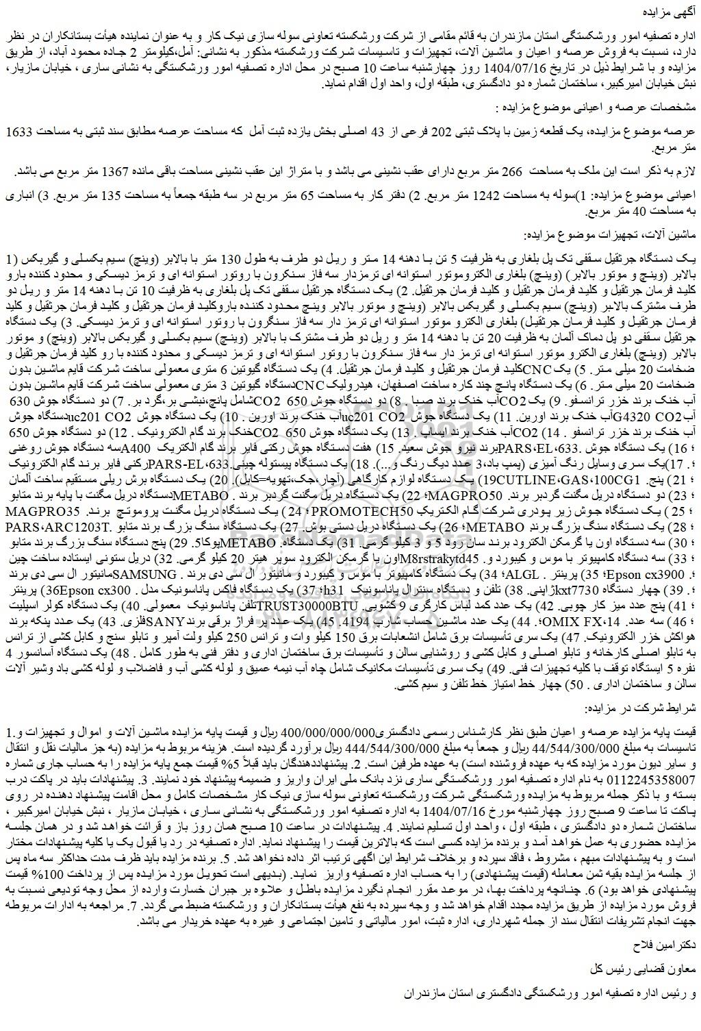 اداره تصفیه امور ورشکستگی استان مازندران به قائم مقامی از شرکت ورشکسته تعاونی سوله سازی نیک کار و به عنوان نماینده هیأت بستانکاران در نظر دارد، نسبت به فروش عرصه و اعیان و ماشین آلات، تجهیزات و تاسیسات شرکت ورشکسته مذکور به نشانی: آمل،کیلومتر 2 جاده محمود آباد، از طریق مزایده و با شرایط ذیل در تاریخ 1404/07/16 روز چهارشنبه ساعت 10 صبح در محل اداره تصفیه امور ورشکستگی به نشانی ساری ، خیابان مازیار، نبش خیابان امیرکبیر، ساختمان شماره دو دادگستری، طبقه اول، واحد اول اقدام نماید.