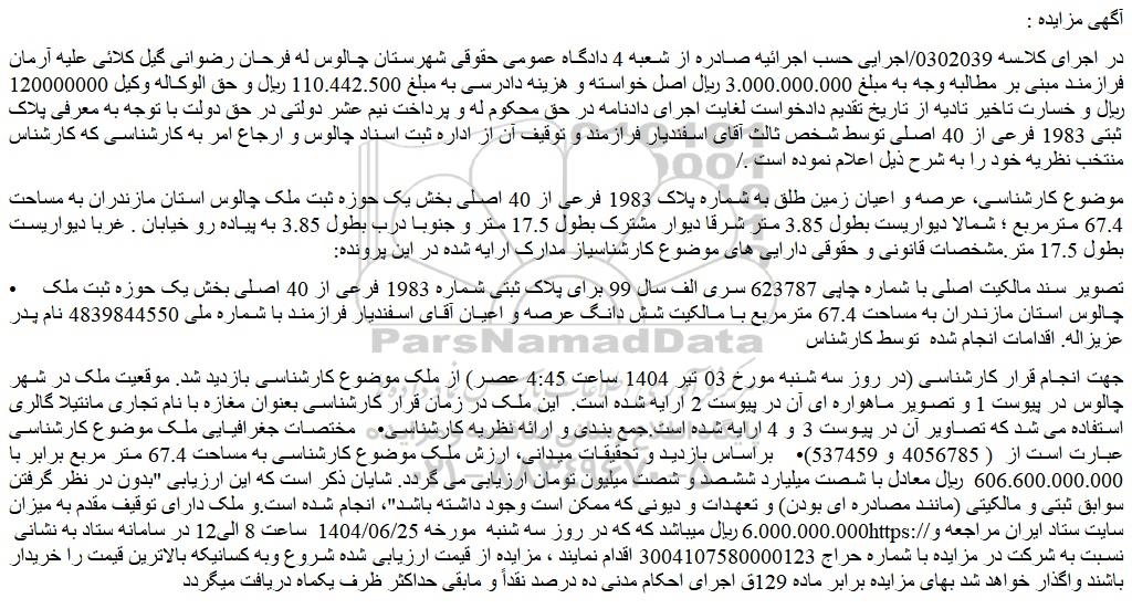 در اجرای کلاسه 0302039/اجرایی حسب اجرائیه صادره از شعبه 4 دادگاه عمومی حقوقی شهرستان چالوس له فرحان رضوانی گیل کلائی علیه آرمان فرازمند مبنی بر مطالبه وجه به مبلغ 3.000.000.000 ریال اصل خواسته و هزینه دادرسی به مبلغ 110.442.500 ریال و حق الوکاله وکیل 120000000 ریال و خسارت تاخیر تادیه از تاریخ تقدیم دادخواست لغایت اجرای دادنامه در حق محکوم له و پرداخت نیم عشر دولتی در حق دولت با توجه به معرفی پلاک ثبتی 1983 فرعی از 40 اصلی توسط شخص ثالث آقای اسفندیار فرازمند و توقیف آن از اداره ثبت اسناد چالوس و ارجاع امر به کارشناسی که کارشناس منتخب نظریه خود را به شرح ذیل اعلام نموده است ./