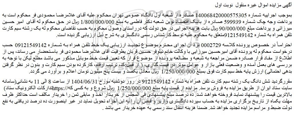 بموجب اجراییه شماره 140068420000575305 صادره از شعبه اول دادگاه عمومی تهران محکوم علیه آقای غلامرضا محمودی فر محکوم است به پرداخت وجه چک شماره 599939 صادره از بانک اقتصاد نوین شعبه دکتر فاطمی به مبلغ 1/800/000/000 ریال در حق محکوم له آقای امیر حسین میرزائی و پرداخت مبلغ 90/000/000 ریال بابت هزینه اجرایی در حق دولت که درراستای وصول محکوم به حسب تقاضای محکوم له یک رشته سیم کارت تلفن همراه به شماره 9121549142متعلق به محکوم علیه توسط کارشناس رسمی دادگستری به شرح ذیل ارزیابی گردیده است.