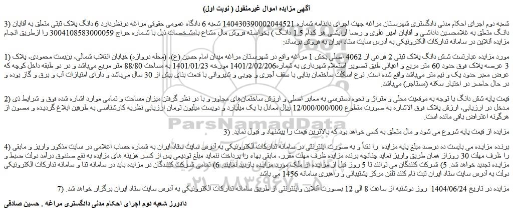 مزایده ملک شش دانگ پلاک ثبتی 2 فرعی از 4062 اصلی, مزایده ملک شش دانگ پلاک ثبتی 2 فرعی از 4062 اصلی