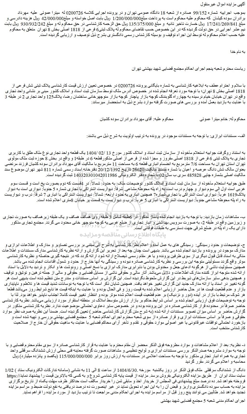 بموجب  اجراییه  شماره 99/152  صادره از شعبه 18 دادگاه عمومی تهران و در پرونده اجرایی کلاسه 0200726 له  میترا عموئی  علیه  مهرداد برادران سوده کیشان  که محکوم علیه محکوم است به پرداخت مبلغ1/200/000/000  ریال بابت اصل خواسته و مبلغ42/000/000  ریال هزینه دادرسی و مبلغ 17/241/269/841  ریال خسارت تاخیر تادیه  و مبلغ 135/375/000 ریال حق الزحمه کارشناسی در حق محکوم له و مبلغ 930/932/242  ریال بابت نیم عشر اجرایی در حق دولت گردیده که در این خصوص حسب تقاضای محکوم له پلاک ثبتی6 فرعی از 1818 اصلی بخش 8 تهران  متعلق به محکوم علیه حسب اعلام محکوم له توسط این اجراء توقیف و بوسیله کارشناس رسمی دادگستری بشرح ذیل توصیف و ارزیابی گردیده است.