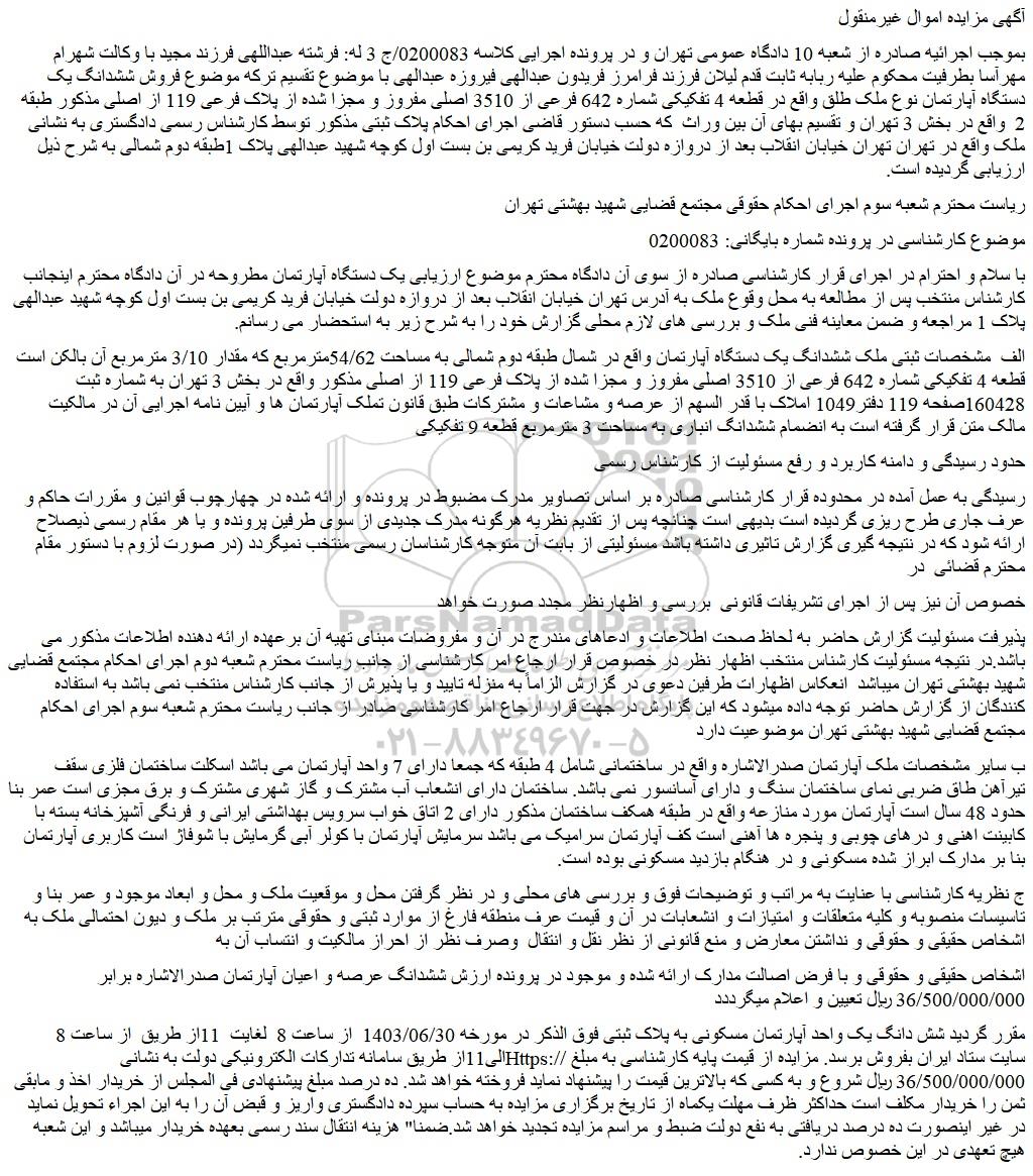 بموجب اجرائیه صادره از شعبه 10 دادگاه عمومی تهران و در پرونده اجرایی کلاسه 0200083/ج 3 له: فرشته عبداللهی فرزند مجید با وکالت شهرام مهرآسا بطرفیت محکوم علیه ربابه ثابت قدم لیلان فرزند فرامرز فریدون عبدالهی فیروزه عبدالهی با موضوع تقسیم ترکه موضوع فروش ششدانگ یک دستگاه آپارتمان نوع ملک طلق واقع در قطعه 4 تفکیکی شماره 642 فرعی از 3510 اصلی مفروز و مجزا شده از پلاک فرعی 119 از اصلی مذکور طبقه 2 واقع در بخش 3 تهران و تقسیم بهای آن بین وراث که حسب دستور قاضی اجرای احکام پلاک ثبتی مذکور توسط کارشناس رسمی دادگستری به نشانی ملک واقع در تهران تهران خیابان انقلاب بعد از دروازه دولت خیابان فرید کریمی بن بست اول کوچه شهید عبدالهی پلاک 1طبقه دوم شمالی به شرح ذیل ارزیابی گردیده است.