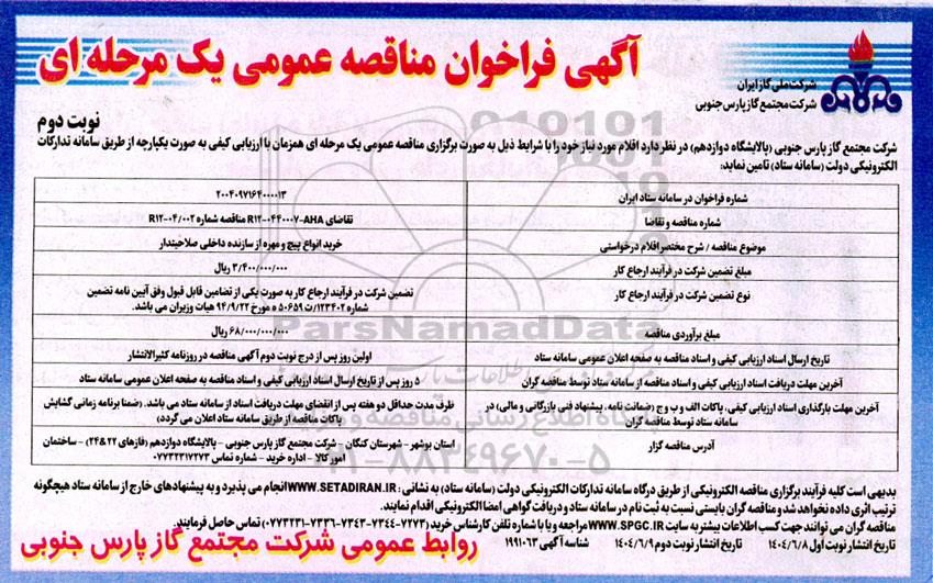 شرکت مجتمع گاز پارس جنوبی (پالایشگاه دوازدهم) در نظر دارد اقلام مورد نیاز خود را با شرایط ذیل بصورت برگزاری مناقصه عمومی یک مرحله ای همزمان با ارزیابی کیفی بصورت یکپارچه از طریق سامانه تدارکات الکترونیکی دولت سامانه ستادتامین نماید
