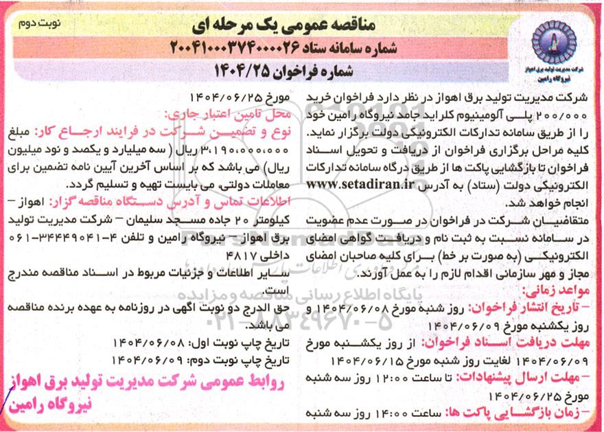 شرکت مدیریت تولید برق اهواز در نظر دارد فراخوان خرید 200.000 پلی آلومینیوم کلراید جامد نیروگاه رامین خود را از طریق سامانه تدارکات الکترونیکی دولت برگزار نماید. کلیه مراحل برگزاری فراخوان از دریافت و تحویل اسناد فراخوان تا بازگشایی پاکتها از طریق درگاه سامانه تدارکات الکترونیکی دولت (ستاد) به آدرس ستاد ایران انجام خواهد شد. متقاضیان شرکت در فراخوان در صورت عدم عضویت در سامانه نسبت به ثبت نام و دریافت گواهی امضای الکترونیکی به صورت بر خط برای کلیه صاحبان امضای مجاز و مهر سازمانی اقدام لازم را به عمل آورند.