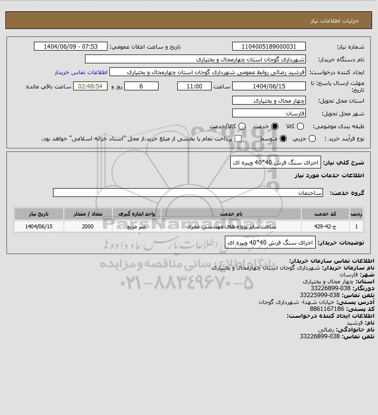 شرح کلی نیاز: اجرای سنگ فرش 40*40 ویبره ای