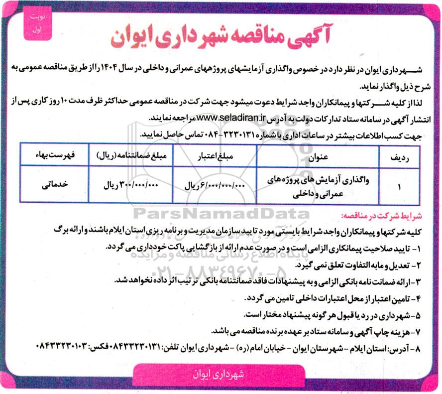شهرداری ایوان در نظر دارد در خصوص واگذاری آزمایش های پروژه های عمرانی و داخلی در سال 1404 را از طریق مناقصه عمومی به شرح ذیل واگذار نماید.