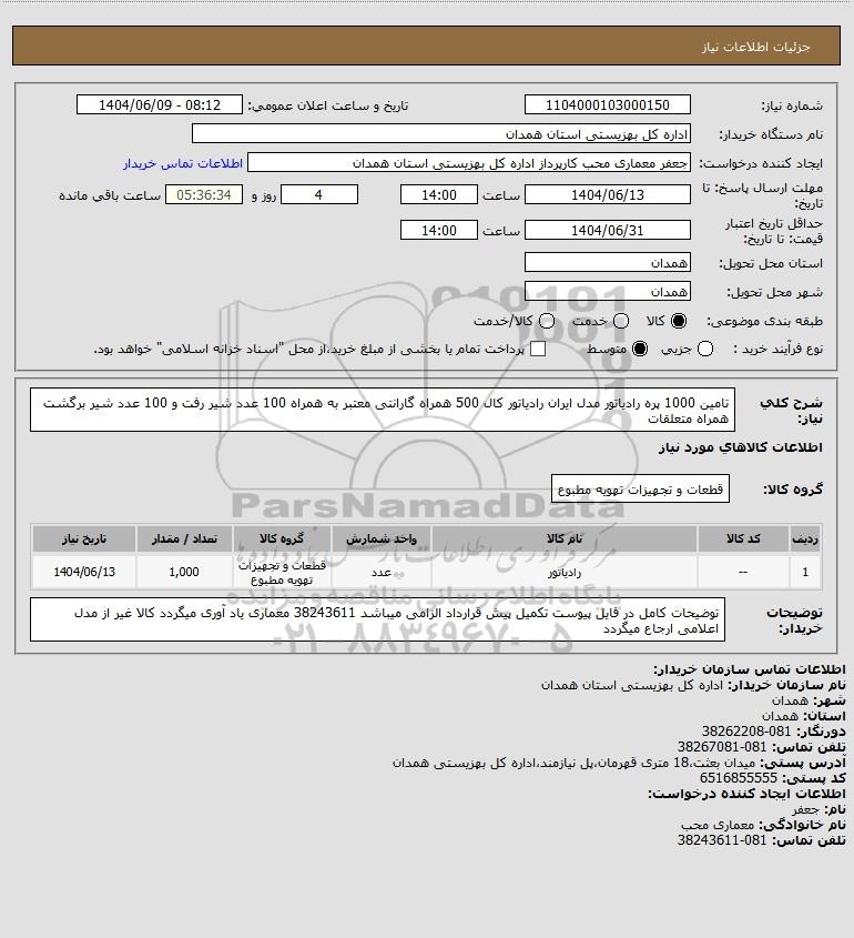 شرح کلی نیاز: تامین 1000 پره رادیاتور مدل ایران رادیاتور کال 500 همراه گارانتی معتبر به همراه 100 عدد شیر رفت و 100 عدد شیر برگشت همراه متعلقات