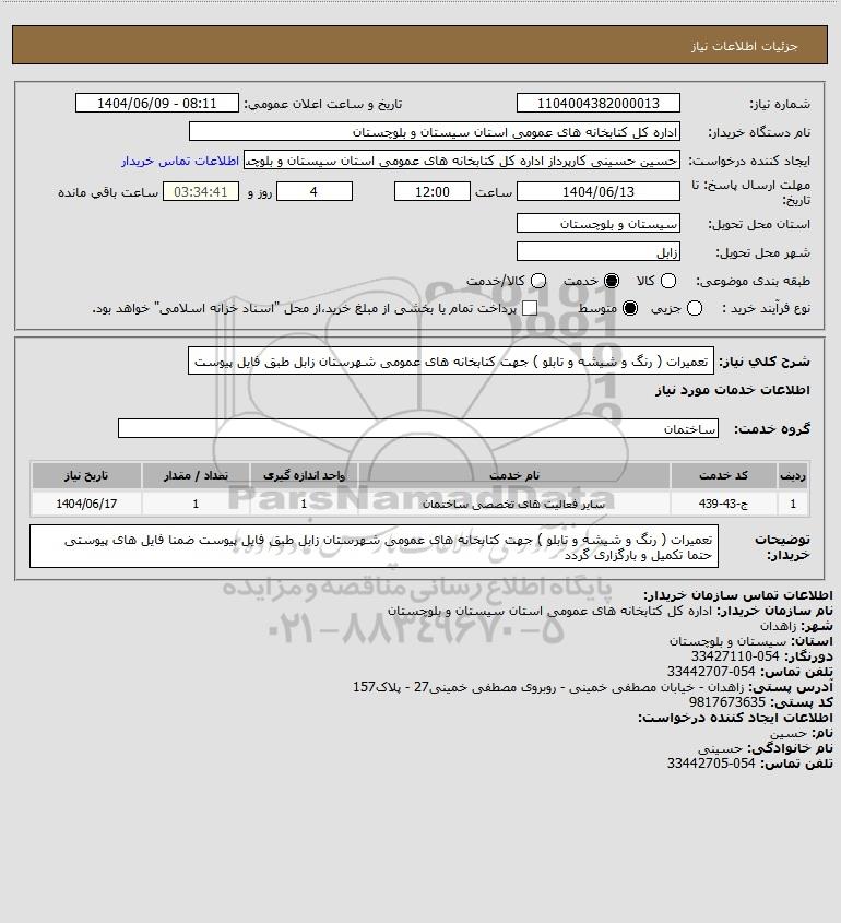 شرح کلی نیاز: تعمیرات ( رنگ و شیشه و تابلو ) جهت کتابخانه های عمومی شهرستان زابل طبق فایل پیوست