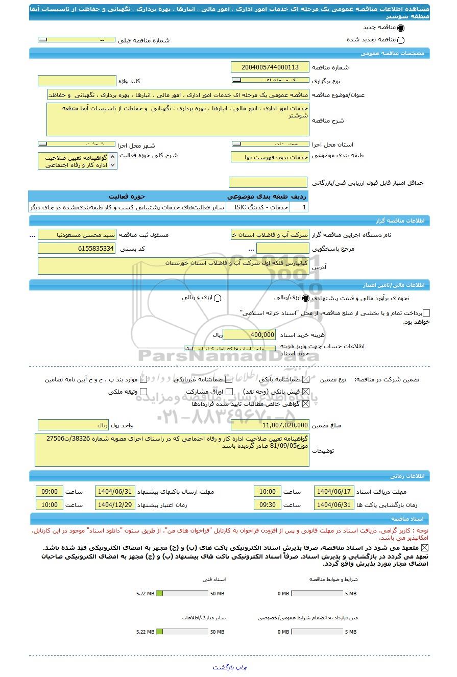 | شرح مناقصه | خدمات امور اداری ، امور مالی ، انبارها ، بهره برداری ، نگهبانی و حفاظت از تاسیسات آبفا منطقه شوشتر | ||||||||