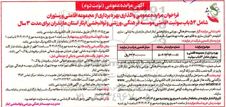 مزایده عمومی واگذاری بهره برداری از مجموعه اقامتی و رستوران شامل 54 باب سوئیت اقامتی موسسه فرهنگی ورزشی و توانبخشی ایثار استان مازندران برای مدت 3 سال