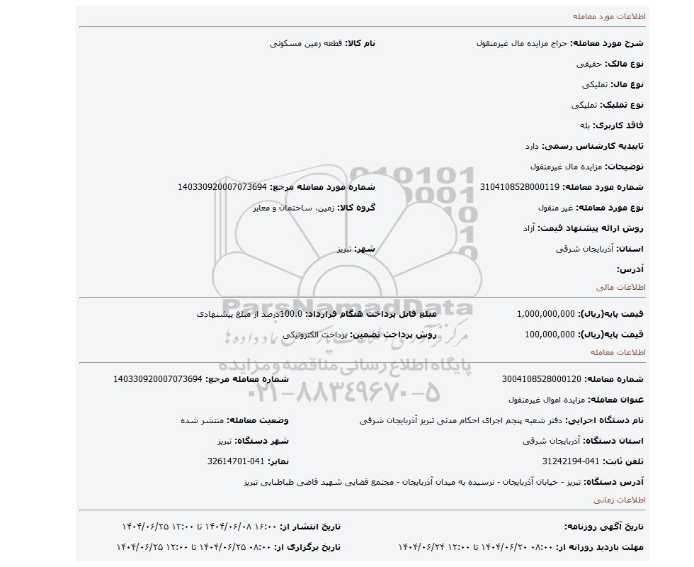 | عنوان معامله: مزایده اموال غیرمنقول | ||