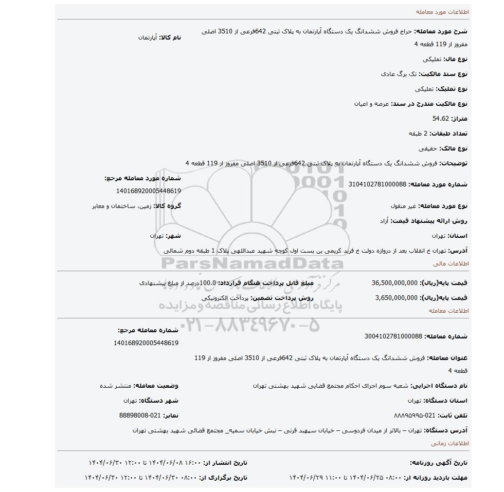 شرح مورد معامله: حراج فروش ششدانگ یک دستگاه آپارتمان به پلاک ثبتی 642فرعی از 3510 اصلی مفروز از 119 قطعه 4نام کالا: آپارتمان