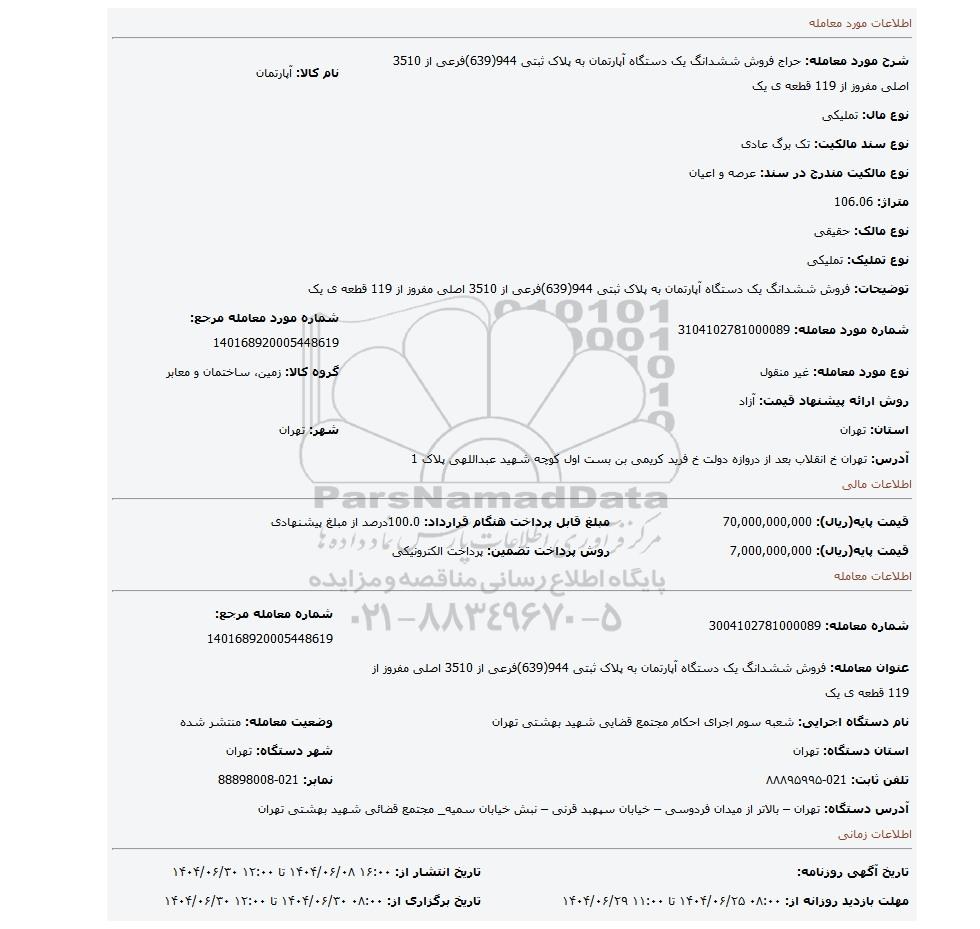 شرح مورد معامله: حراج فروش ششدانگ یک دستگاه آپارتمان به پلاک ثبتی 944(639)فرعی از 3510 اصلی مفروز از 119 قطعه ی یکنام کالا: آپارتمان