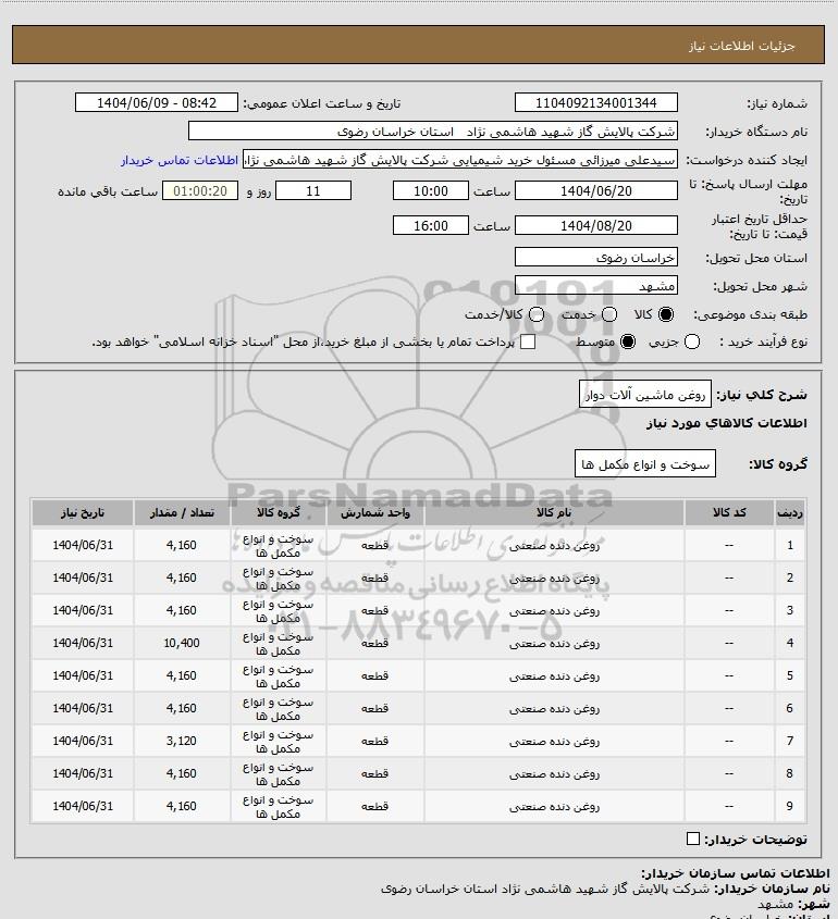| 9 | -- | روغن دنده صنعتی | قطعه | سوخت و انواع مکمل ها | 4,160 | 1404/06/31 |