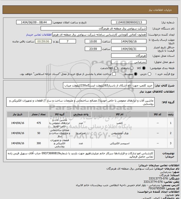 شرح کلی نیاز: خرید کلمپ جهت رفع اشکال از باسبار63کیلوولت ایستگاه230کیلوولت میناب