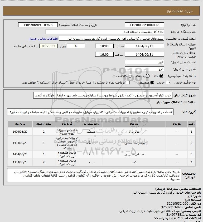 شرح کلی نیاز: خرید کولر آبی،پرینتر،صندلی و کمد (طبق شرایط پیوست) مدارک پیوست باید مهر و امضا و بارگذاری گردد.