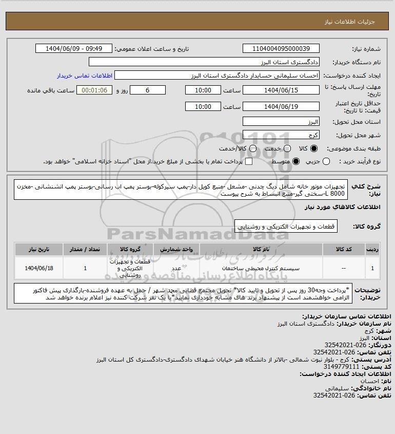 | 1 | -- | سیستم کنترل محیطی ساختمان | عدد | قطعات و تجهیزات الکتریکی و روشنایی | 1 | 1404/06/18 |