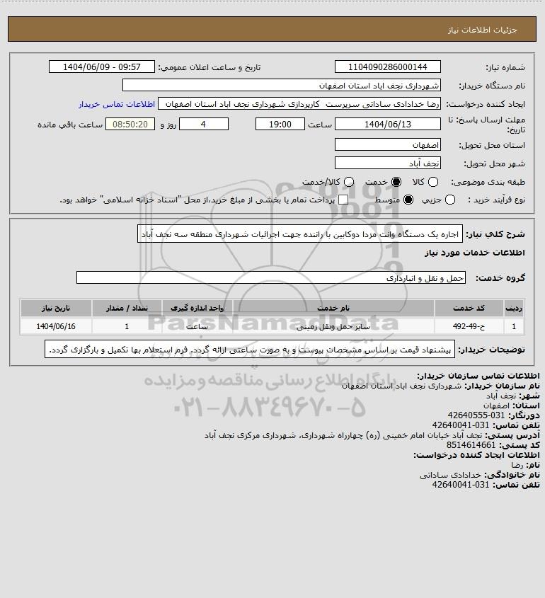 شرح کلی نیاز: اجاره یک دستگاه وانت مزدا دوکابین با راننده جهت اجرائیات شهرداری منطقه سه نجف آباد