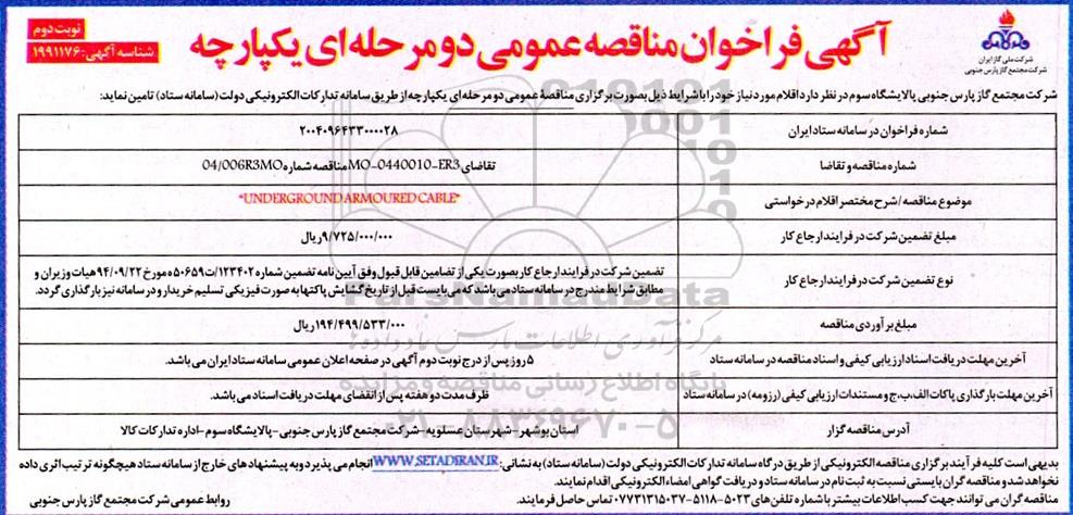 مناقصه UNDER GROUND ARMOURED CABLE / نوبت دوم از کلیه افراد متخصص و شرکتها واجد شرایط دعوت به عمل میآید در مناقصه با کد خبرگزاری پارس نماد: 9480119 شرکت نمایند.