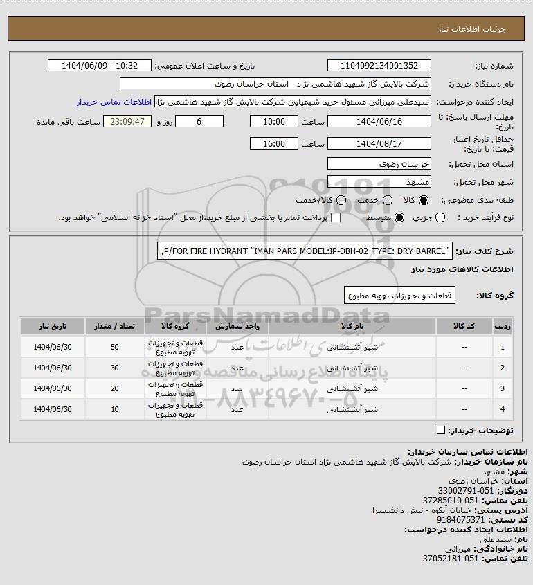 شرح کلی نیاز: "P/FOR FIRE HYDRANT "IMAN PARS