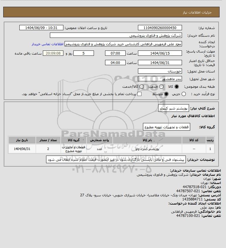 شرح کلی نیاز: پوزیشنر شیر کنترل
