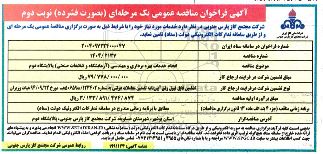 شرکت مجتمع گاز پارس جنوبی در نظر دارد خدمات مورد نیاز خود را با شرایط ذیل بصورت برگزاری مناقصه عمومی یک مرحله ای از طریق سامانه تدارکات الکترونیکی دولت سامانه ستاد تامین نماید.