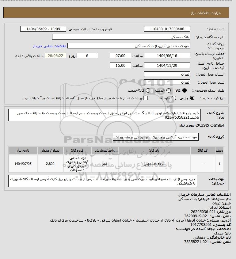 | 1 | -- | پارچه فاستونی | متر | مواد معدنی، گیاهی و جانوری غیرخوراکی و منسوجات | 2,800 | 1404/07/05 |