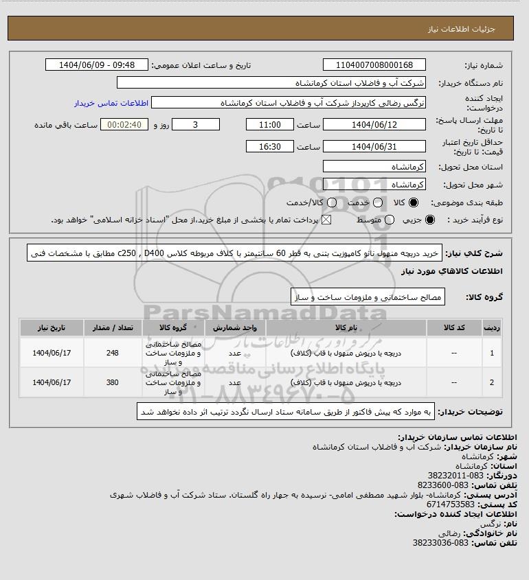 شرح کلی نیاز: خرید دریچه منهول نانو کامپوزیت بتنی به قطر 60 سانتیمتر با کلاف مربوطه کلاس c250 , D400 مطابق با مشخصات فنی