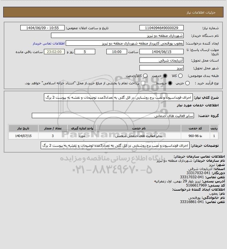 شرح کلی نیاز: اجرای فونداسیون و نصب برج روشنایی در ائل گلی به تعداد3عدد توضیحات و نقشه به پیوست 2 برگ