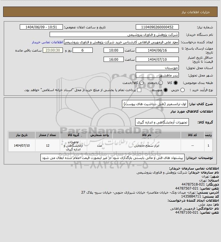 نام دستگاه خریدار:شرکت پژوهش و فناوری پتروشیمی