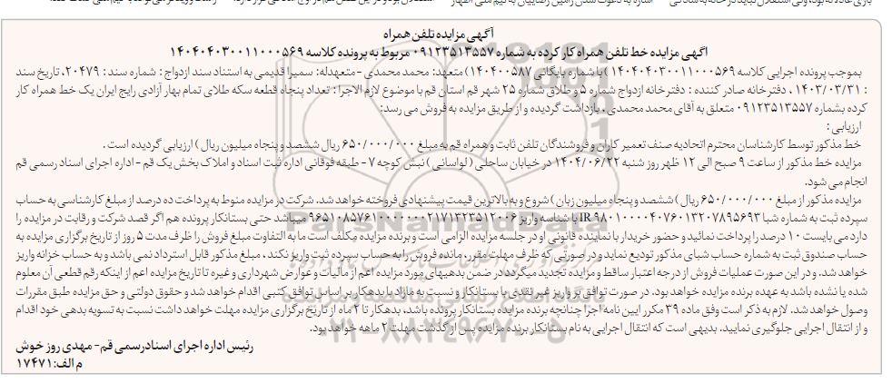 مزایده خط تلفن همراه کارکرده به شماره 09123513557