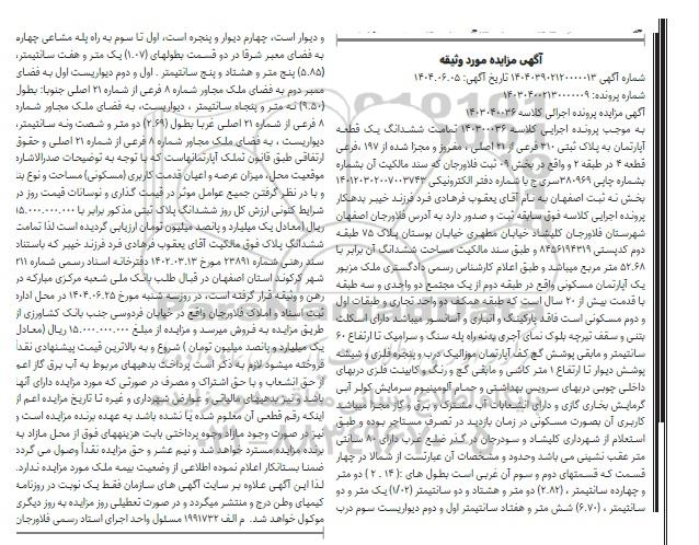 مزایده ششدانگ یک قطعه آپارتمان پلاک ثبتی 310 فرعی کلاسه 140300036