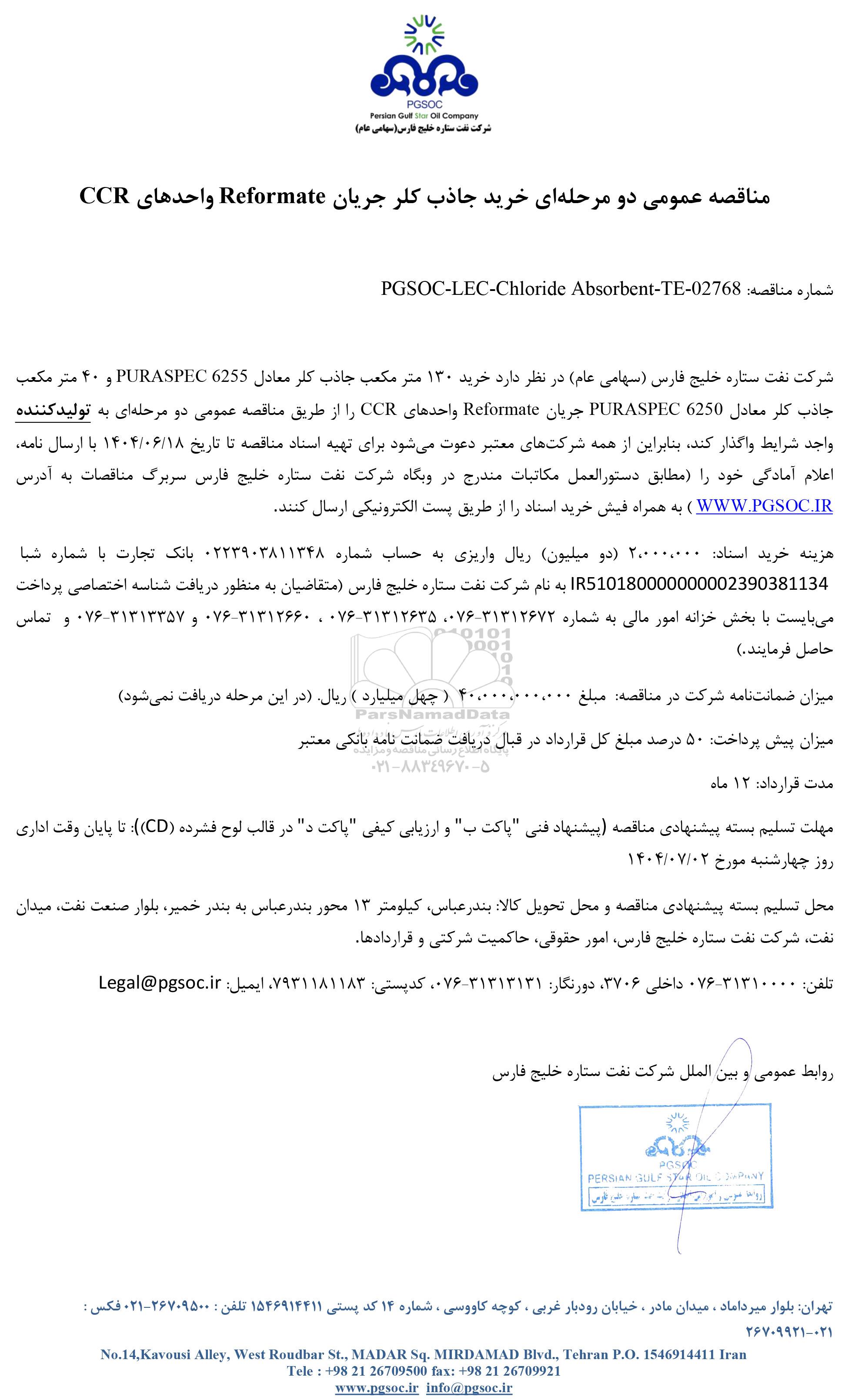 شماره مناقصه: PGSOC-LEC-Chloride Absorbent-TE- 02768