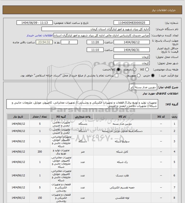 | 1 | -- | دوربین مدار بسته | دستگاه | تجهیزات دفاعی، ایمنی و امنیتی | 5 | 1404/06/12 |