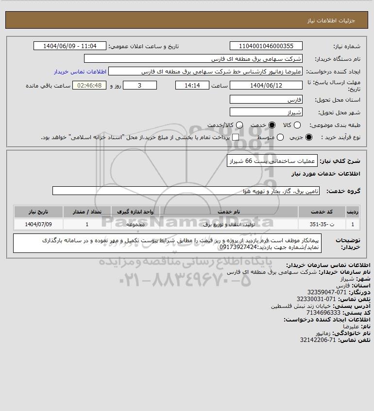 استعلام عملیات ساختمانی پست 66 شیراز, استعلام عملیات ساختمانی پست 66 شیراز