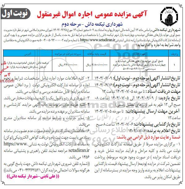 شهرداری تیکمه داش بر اساس ماده 13 آیین نامه مالی شهرداریها و به استناد بند 2-8 مجوز شماره 13 مورخ 1404.04.25 شورای محترم اسلامی شهر در نظر دارد مدیریت جمع آوری عواید بازارهای هفتگی دوشنبه و چهارشنبه بازار شهر تیکمه داش را با مشخصات و شرایط ذیل به مدت یکسال از طریق برگزاری مزایده عمومی و با بهره گیری از سامانه تدارکات الکترونیکی دولت (ستاد ایران) با شماره مزایده 5004005093000002 به صورت الکترونیکی به متقاضیان واجد شرایط به اجاره واگذار نماید: