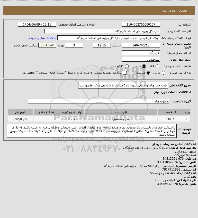 شرح کلی نیاز: بابت حفر چاه ارت اتاق سرور 123 مطابق با شاخص و شرایط پیوست