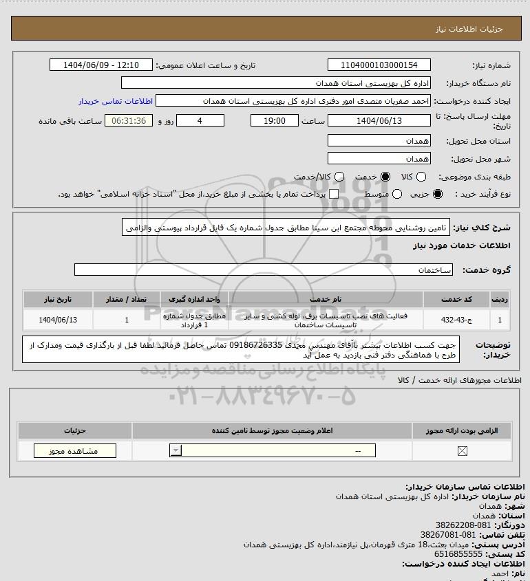 شرح کلی نیاز: تامین روشنایی محوطه مجتمع ابن سینا مطابق جدول شماره یک فایل قرارداد پیوستی والزامی