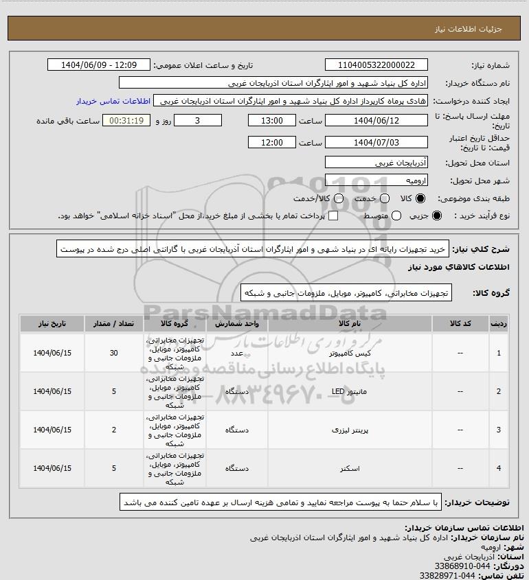 شرح کلی نیاز: خرید تجهیزات رایانه ای در بنیاد شهی و امور ایثارگران استان آذربایجان غربی با گارانتی اصلی درج شده در پیوست