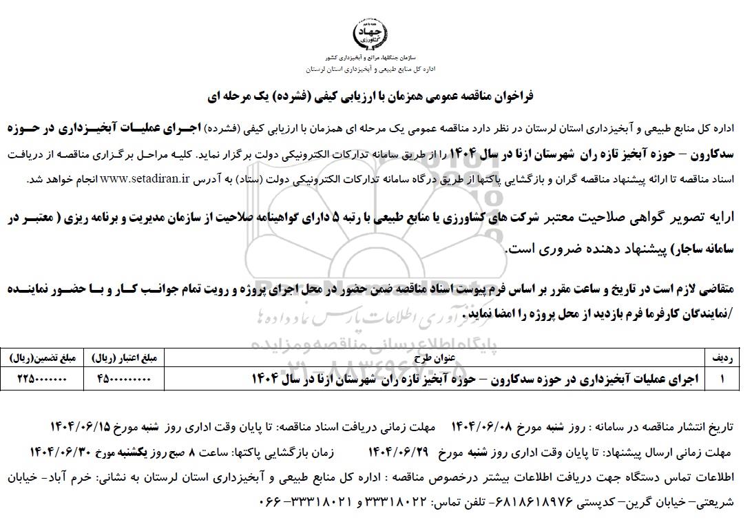 اداره کل منابع طبیعی و آبخیزداری استان لرستان در نظر دارد مناقصه عمومی یک مرحله ای با ارزیابی کیفی (فشرده) اجرای عملیات آبخیزداری در حوزه سد کارون- حوزه آبخیز تازه ران شهرستان ازنا در سال 1404 را از طریق سامانه تدارکات الکترونیکی دولت برگزار نماید کلیه مراحل برگزاری مناقصه از دریافت اسناد مناقصه تا ارائه پیشنهاد مناقصه گران و بازگشایی پاکتها از طریق درگاه سامانه تدارکات الکترونیکی دولت (ستاد) ایران انجام خواهد شد.