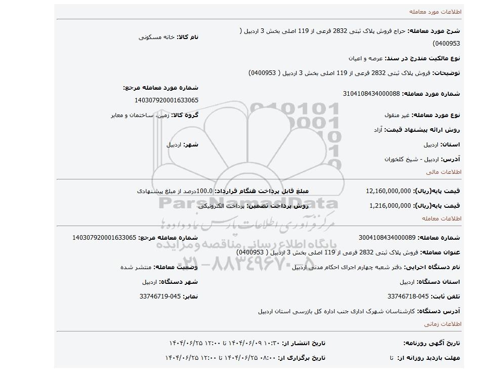 مزایده عمومی مزایده فروش پلاک ثبتی 2832 فرعی از 119 اصلی بخش 3 اردبیل ( 0400953) برگزار میگردد. از کلیه افراد متخصص و شرکتهای واجد شرایط دعوت به عمل میآید تا در این مزایده با کد خبرگزاری پارس نماد : 9481539 شرکت نمایند تاریخ شروع مزایده : 1404/06/09 مهلت شرکت در مزایده: تا پایان روز 1404/06/25
