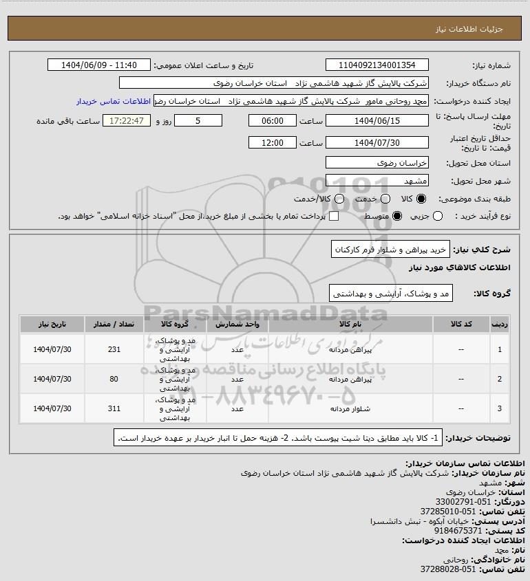 نام دستگاه خریدار:شرکت پالایش گاز شهید هاشمی نژاد استان خراسان رضوی