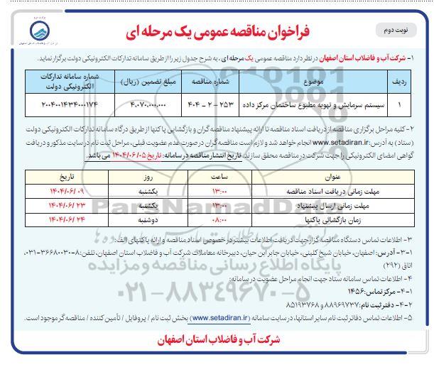 | 1 | سیستم سرمایش و تهویه مطبوع ساختمان مرکز داده | 253-2-404 | 4.070.000.000 | 2004001434000174 |