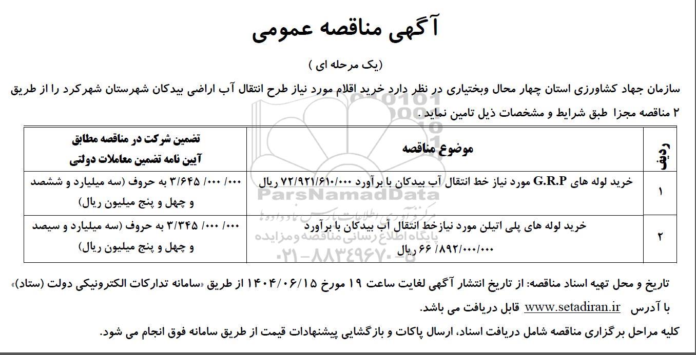 سازمان جهاد کشاورزی استان چهارمحال و بختیاری در نظر دارد خرید اقلام مورد نیاز طرح انتقال آب اراضی بیدکان شهرستان شهرکرد را از طریق 2 مناقصه مجزا طبق شرایط و مشخصات ذیل تامین نماید .