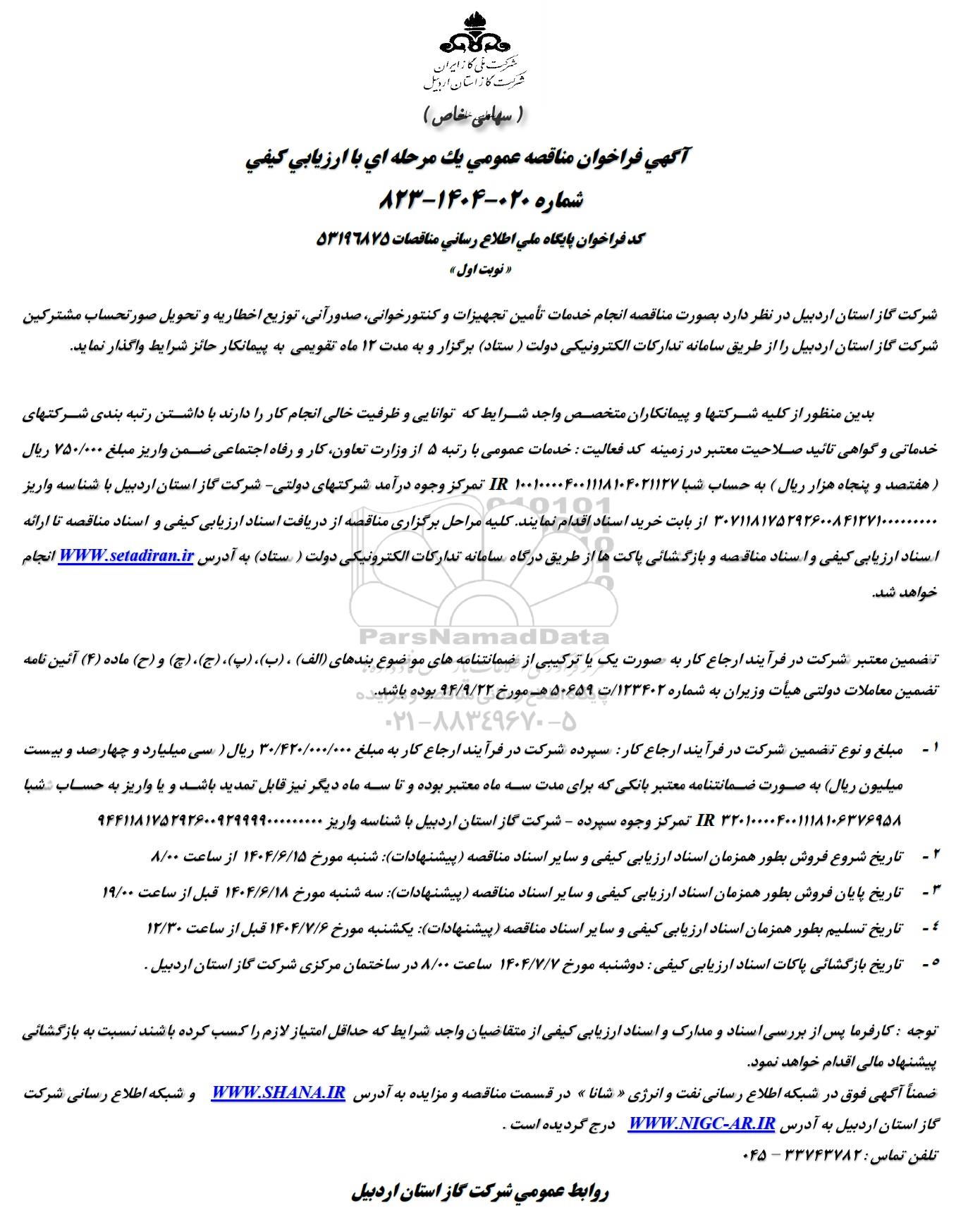 شرکت گاز استان اردبیل در نظر دارد بصورت مناقصه انجام خدمات تأمین تجهیزات و کنتور خوانی، صدور آنی، توزیع اخطاریه و تحویل صورتحساب مشترکین شرکت گاز استان اردبیل را از طریق سامانه تدارکات الکترونیکی دولت (ستاد) برگزار و به مدت 12 ماه تقویمی به پیمانکار حائز شرایط واگذار نماید.