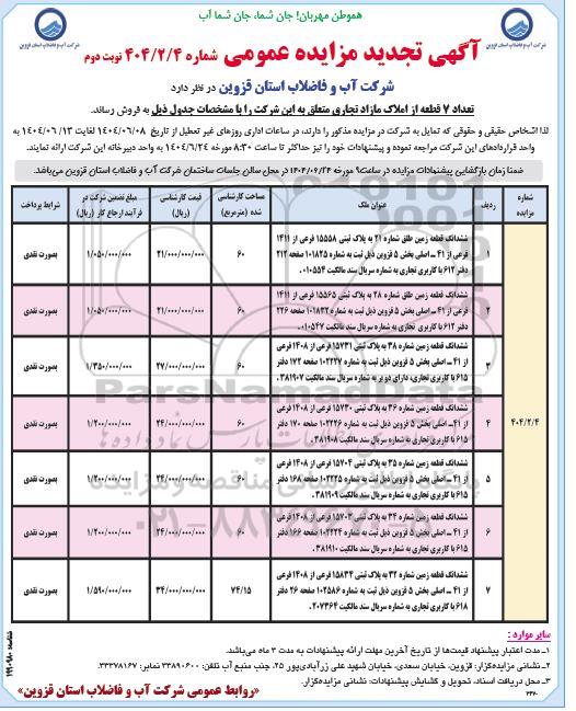 شرکت آب و فاضلاب استان قزوین در نظر دارد تعداد 7 قطعه از املاک مازاد تجاری این شرکت را با مشخصات جدول ذیل به فروش رساند. لذا اشخاص حقیقی و حقوقی که تمایل به شرکت در مزایده مذکور را دارند در ساعات اداری روزهای غیر تعطیل از تاریخ 1404.6.8 لغایت 1404.6.13 به واحد قراردادهای این شرکت مراجعه نموده و پیشنهادات خود را نیز حداکثر تا ساعت 8.30 مورخه 1404.6.24 به واحد دبیرخانه این شرکت ارائه نمایند. ضمناً زمان بازگشایی پیشنهادات مزایده در ساعت 9 مورخه 1404.6.24 در محل سالن جلسات ساختمان شرکت آب و فاضلاب استان قزوین می باشد.