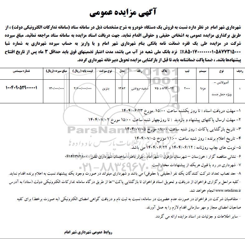 شهرداری شهر امام در نظر دارد نسبت به فروش یک دستگاه خودرو به شرح مشخصات ذیل در سامانه ستاد سامانه تدارکات الکترونیکی دولت ، از طریق برگذاری مزایده عمومی به اشخاص حقیقی و حقوقی اقدام نماید جهت دریافت اسناد مزایده به سامانه ستاد مراجعه نمائید. مبلغ سپرده شرکت در مزایده طی یک فقره ضمانت نامه بانکی بنام شهرداری شهر امام و یا واریز به حساب سپرده شهرداری به شماره شبا IR850170000000105877315000 نزد بانک ملی شعبه در آب می باشد مدت اعتبار تضمینهای فوق باید حداقل 3 ماه پس از تاریخ افتتاح پیشنهادها باشد ، ضمنا پاکت ضمانتنامه باید تا قبل از بازگشایی مزایده تحویل دبیرخانه شهرداری گردد.